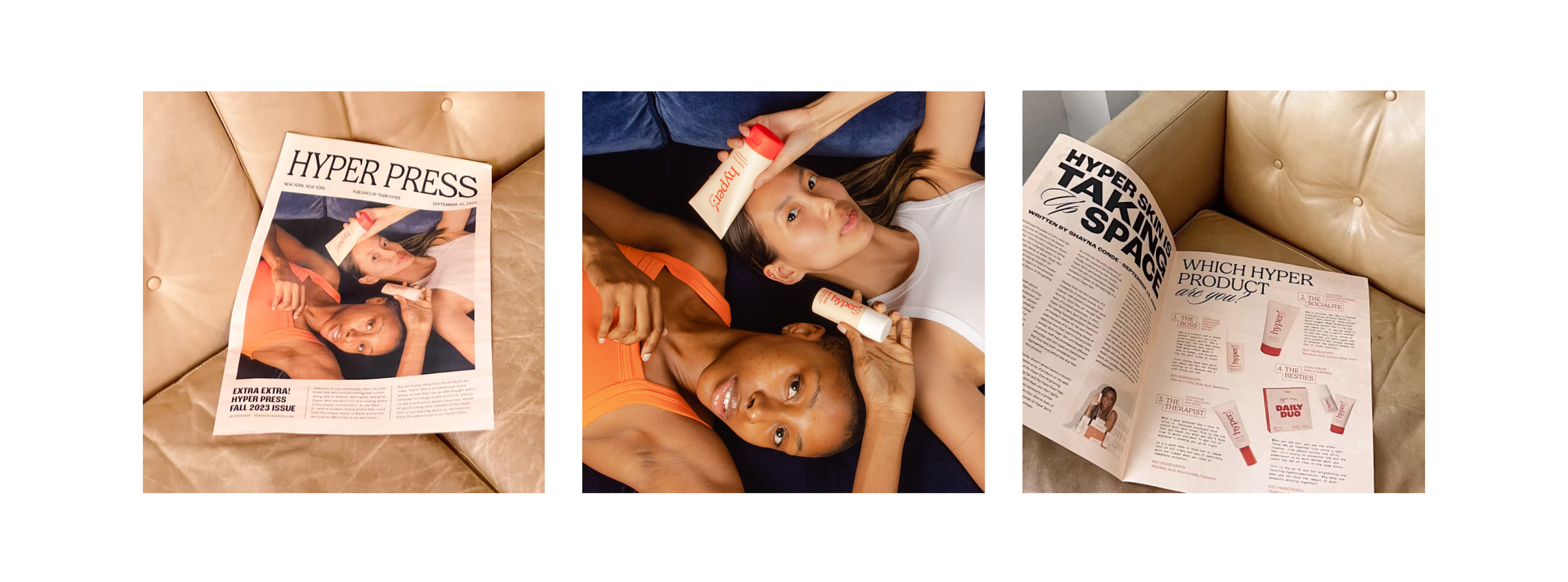Custom newspaper “Hyper Press” created to celebrate Hyper Skin’s launch in Heyday stores.
